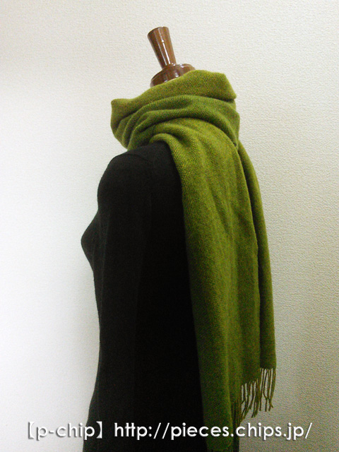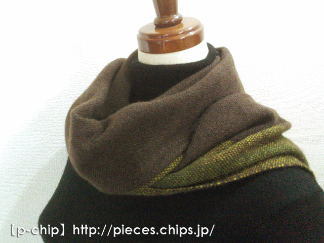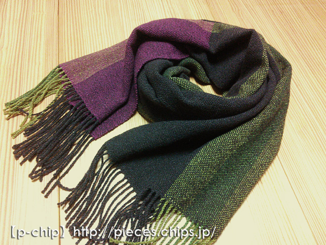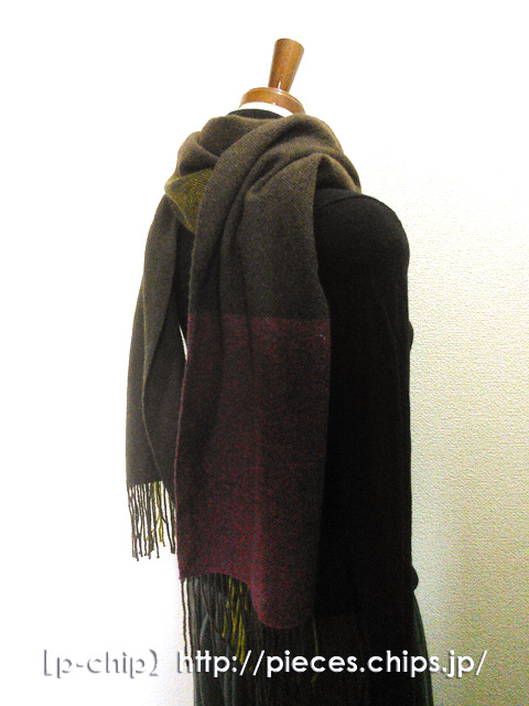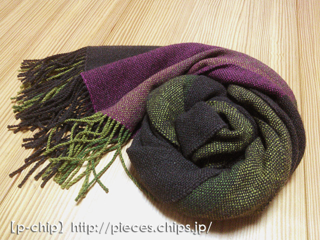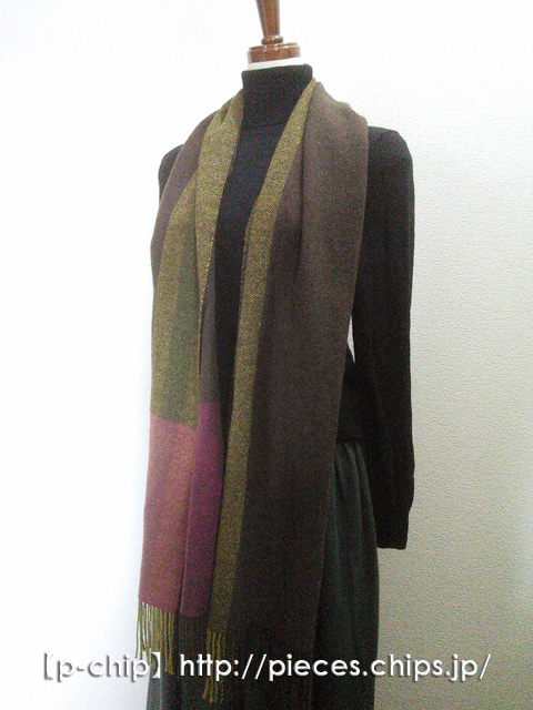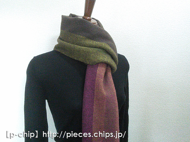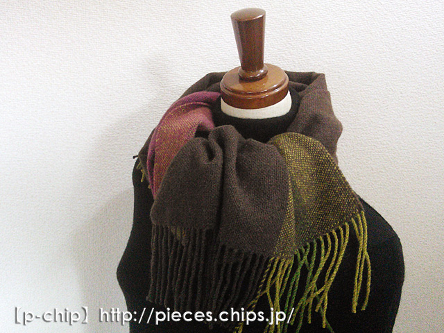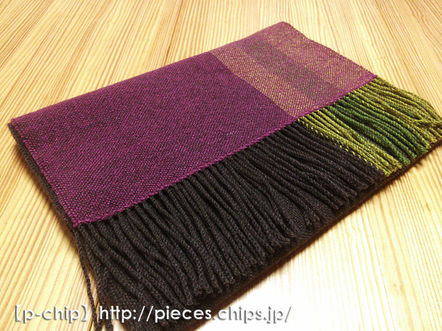 幅広マフラー、ヤクの糸で3つめを織っていて