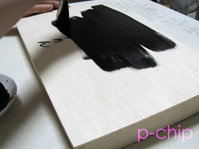 色やニスがくっつかないように、クッキングシートを挟んでます。